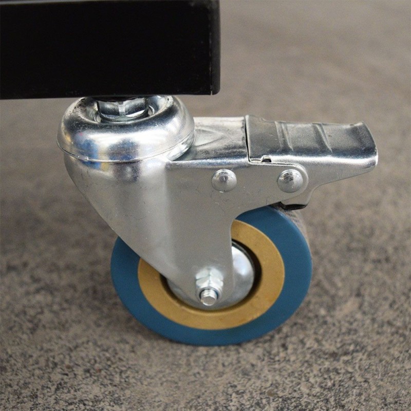 Patas acero negro sección 30x30mm y 8 ruedas de 75mm, 4 de ellas con freno, para trasladar fácilmente la mesa e inmovilizarla adecuadamente en el momento de juego.